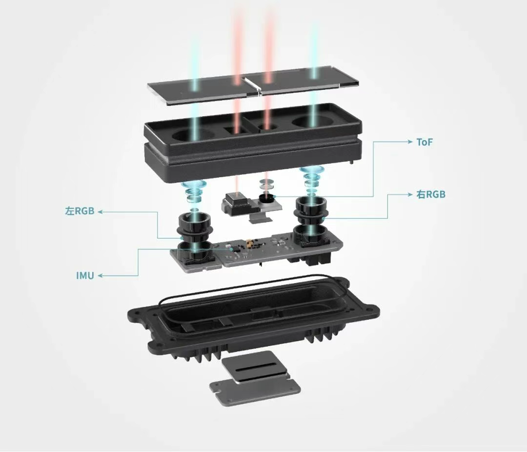 值得一提的是,部署了端侧AI深度模型的双目RGB模块,可精准识别透明水瓶、玻璃门等ToF难以识别的物体;而ToF模块则能辅助双目RGB模块在暗光、强逆光、无纹理等识别受限场景下的真实、准确的深度真值数据输出,二者协同互补,进一步拓宽了方案的适用场景。